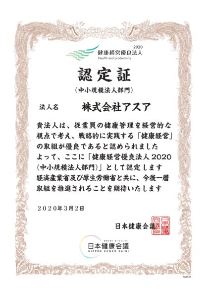 経済産業省の制度設計に基づき、特に優れた「健康経営」を行う事業所を認定する制度、「健康経営優良法人」にアスアが認定されました。