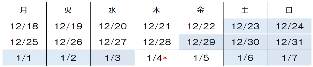 ※網掛け部分が休業日です。また、2024年1月4日木曜日は全体会議のため、1月5日金曜日より通常営業を開始いたします。